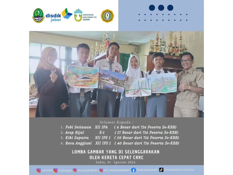 Selamat dan Sukses kepada siswa/i SMAS Cipta Mandiri Cisarua yang sudah mengikuti kegiatan Lomba Menggambar yang di selenggarakan oleh Kereta Cepat CRRC. Alhamdulillah Siswa-siswi Mendapatkan hasil yang baik. ...