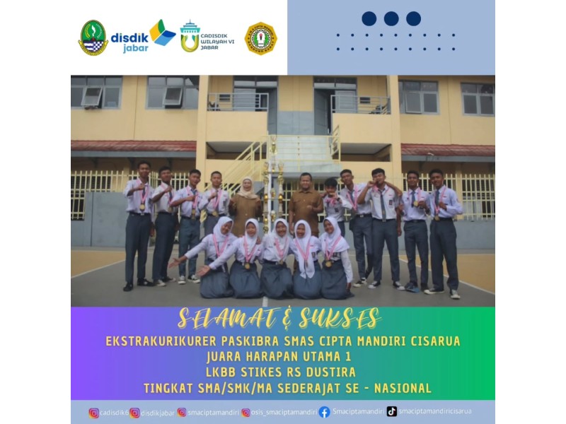 Selamat & Sukses kami ucapkan kepada Paskibra SMAS Cipta Mandiri Cisarua sebagai juara harapan utama 1 LKBB STIKES RS DUSTIRA Tingkat SMA/SMK/MA Sederajat Se - Nasional Tahun 2024. ...